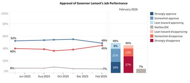 Lamont remains broadly popular among likely Democratic primary voters, with 54 percent holding a favorable opinion. His approval rating among all Connecticut residents has dipped to 49 percent approve and 45 percent disapprove — a net approval of +4, down from +17 in November. Approval of Lamont among specifically Democrats has fallen from 86 percent to 76 percent since November 2025.