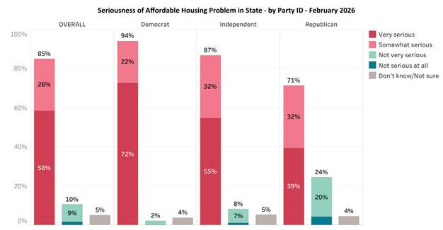 The poll data suggests voters of all party affiliations are focused on affordable housing. Eighty-five percent of Connecticut residents say affordable housing is a very or somewhat serious problem in the state, including 94 percent of Democrats, 87 percent of Independents, and 71 percent of Republicans.