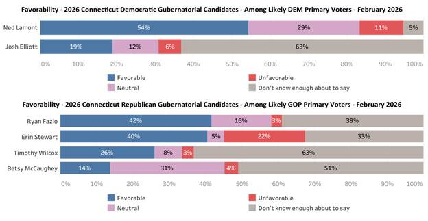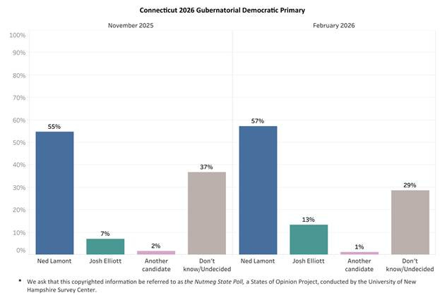 [1] The Nutmeg State Poll was conducted by the University of New Hampshire Survey Center between February 12 and February 16, 2026, among 583 Connecticut residents. The margin of sampling error is +/- 4.1%. The poll included 174 likely Democratic primary voters (MOE +/- 7.4%) and 99 likely Republican primary voters (MOE +/- 9.8%). Data were weighted by sex, age, education, region, party registration, and 2024 election results.