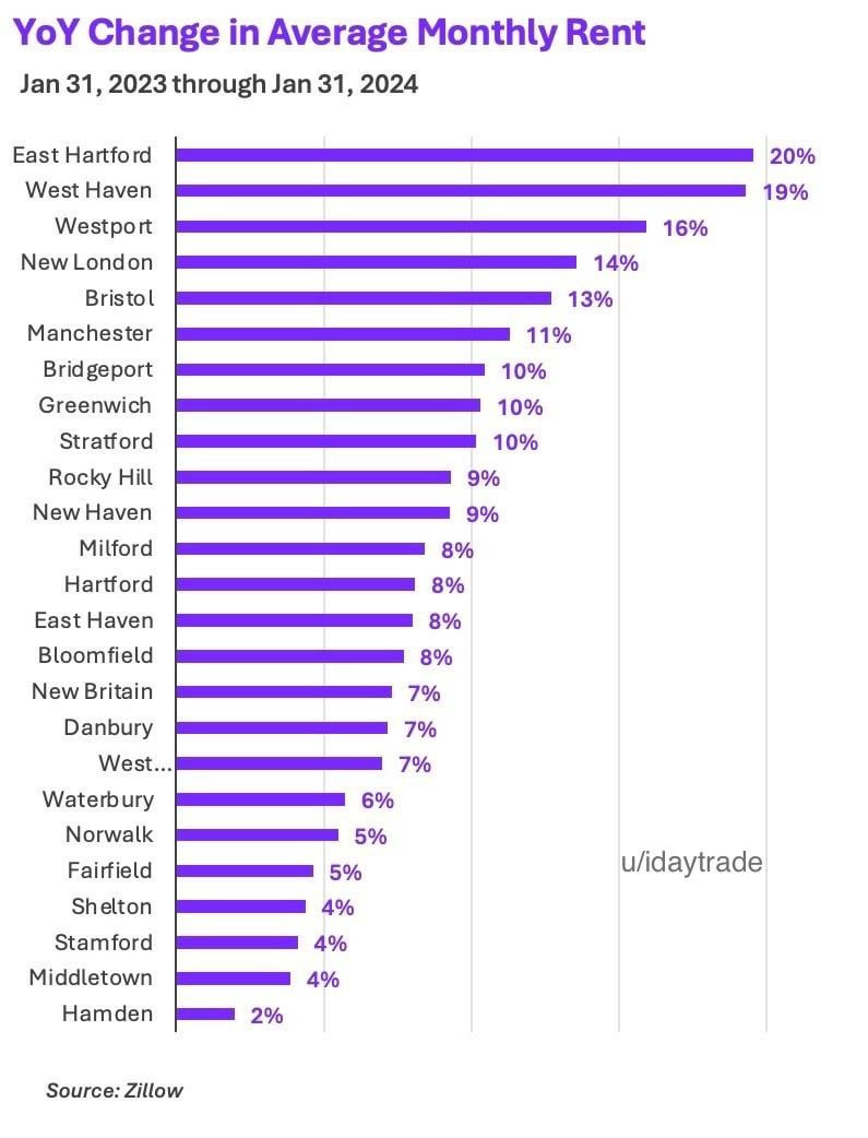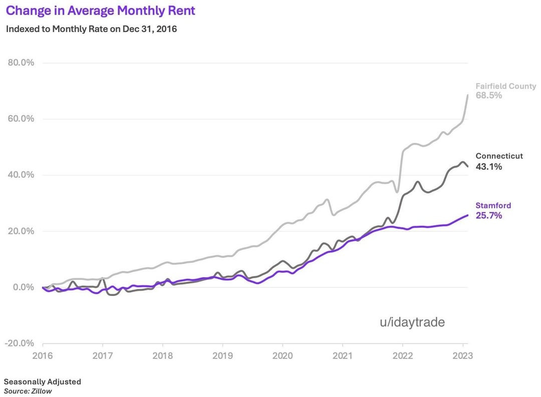An analysis of monthly average rent in Connecticut cities showed Stamford had one of the lowest rent increases in the state. While Stamford’s rent increases are still significant, they are less than other communities that have not built market rate housing.