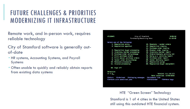 In 2020, Stamford was one of four cities in the United States that still used “green screen.” Mayor David Martin proposed an initiative to replace the software which began in 2021. The City announced it would switch to Oracle which is “still underway and in the final stages” according to a city official.